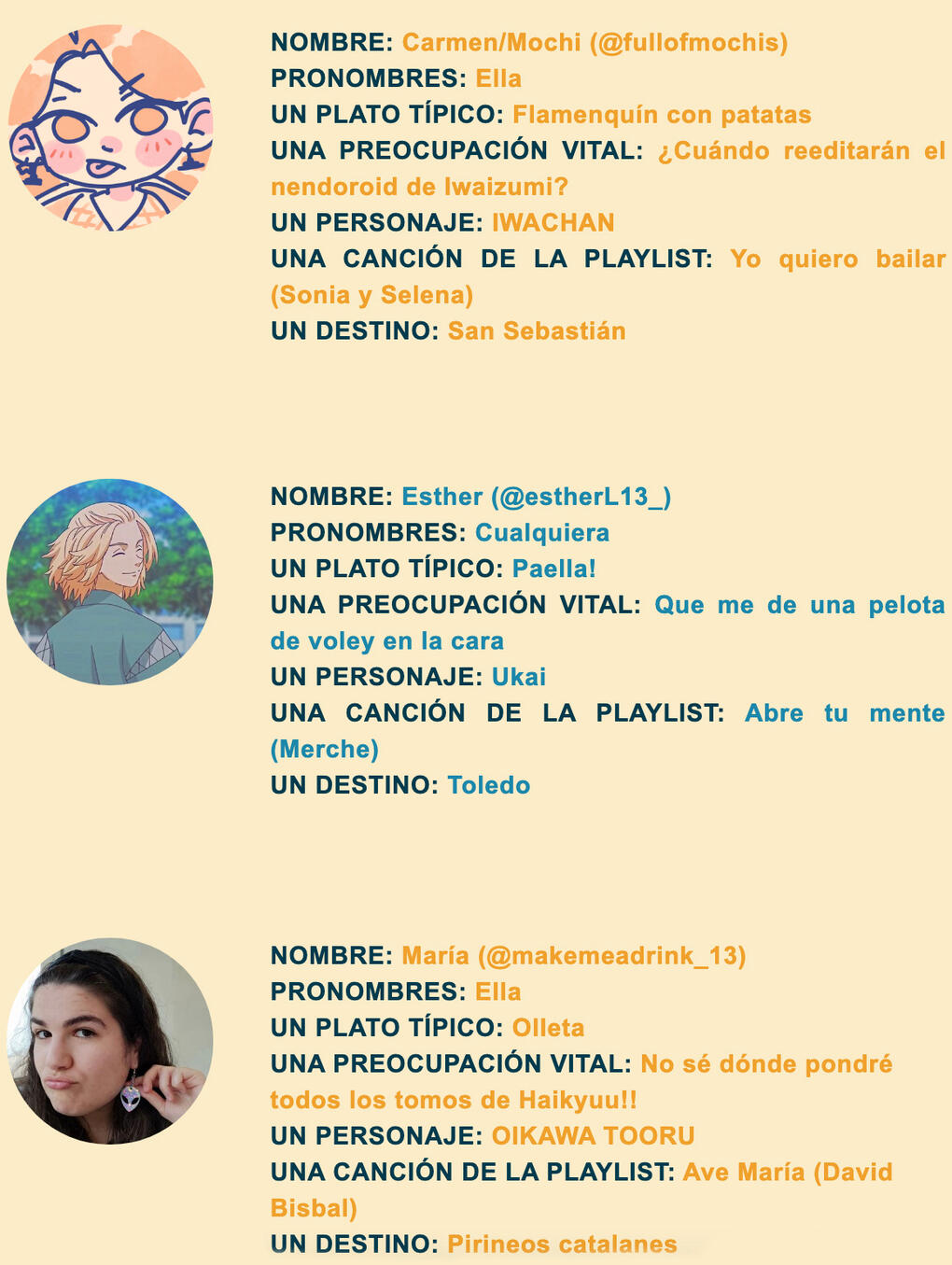 Antes que nada, recordamos que el zine trata sobre les chavales de Haikyuu recorriendo ciudades españolas. Les mods, en base a los resultados del interest check, hemos seleccionado varias ciudades, ships y amistades que repartiremos entre les colaboradores finales del zine. En total hay 11 ships y 6 amistades.
